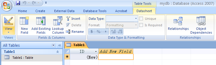 Activate MS-Access 2007, Click the Office button at the top-left corner --> click "New" --> click the "open folder" icon right to the file name box to specify the folder where the database file will be saved --> click the "OK" --> a file called mydb.accdb is to be created under the specified dicrectory --> click "create".