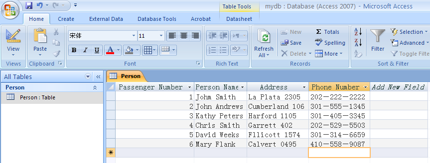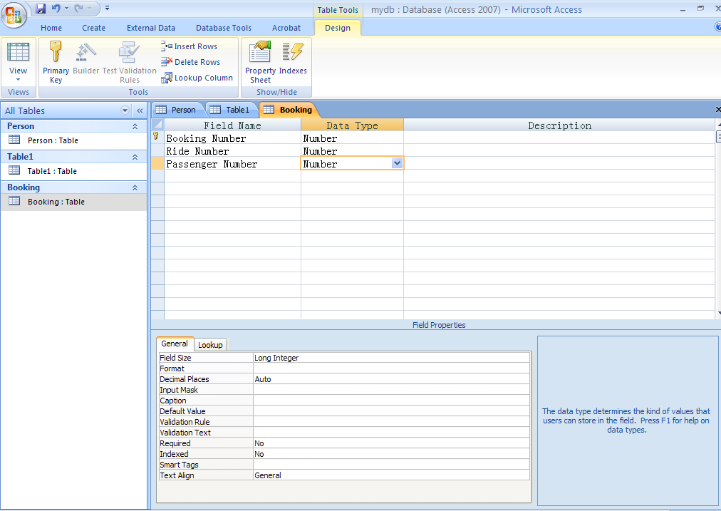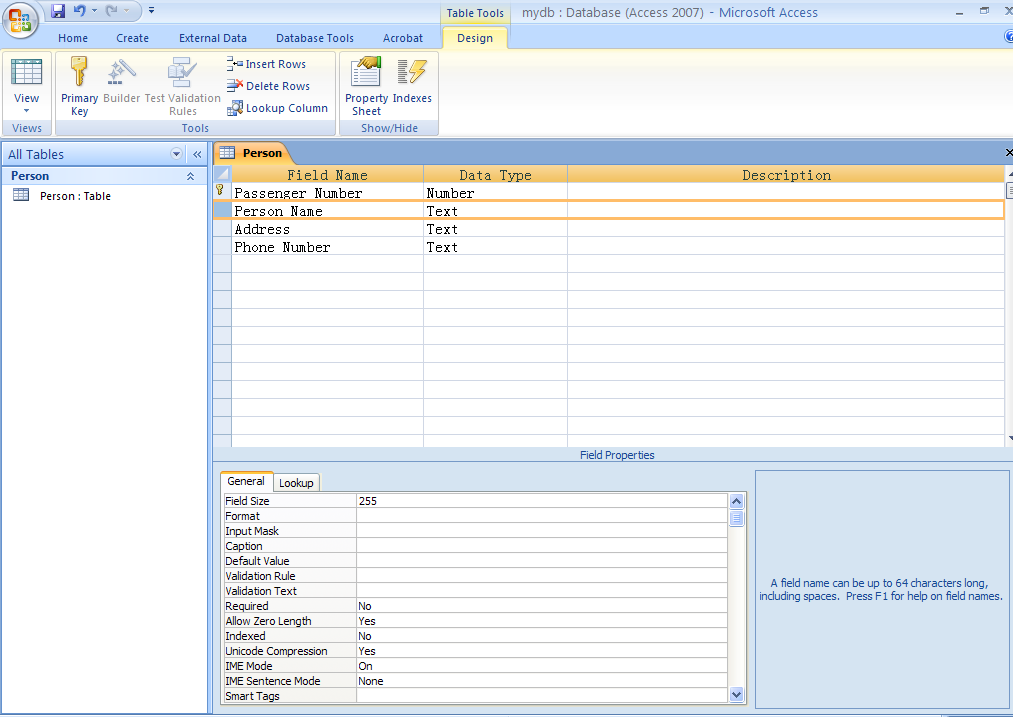 Type in the Field Name and specify Data Type for the Person table. Field name must be unique, but only within the same table. Select field type from a menu. Use date/time for times; use text for phone numbers. I use number for Passenger Number. If AutoNumber is used, only one AutoNumber is allowed in one table. Here is the structure of the Person table.