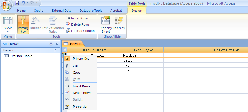 By default, the first field is automatically specified as the primary key of the table and a "key" icon appears to the left of the field. However, the primary key can be specified by moving the mouse cursor to the empty button-like cell left to Passenger Number (that is the most top-left cell), right-click that empty cell, select "Primary Key"; a "key" icon appears to the left of the field of Passenger Number. (Note that empty cell and button-like cell are my terms, the official MS-Access documentation may use different terms.)