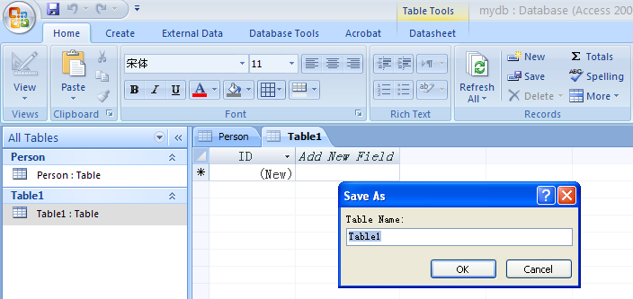 Click the "create" tab, an interface for defining the fields of Table1 is shown: