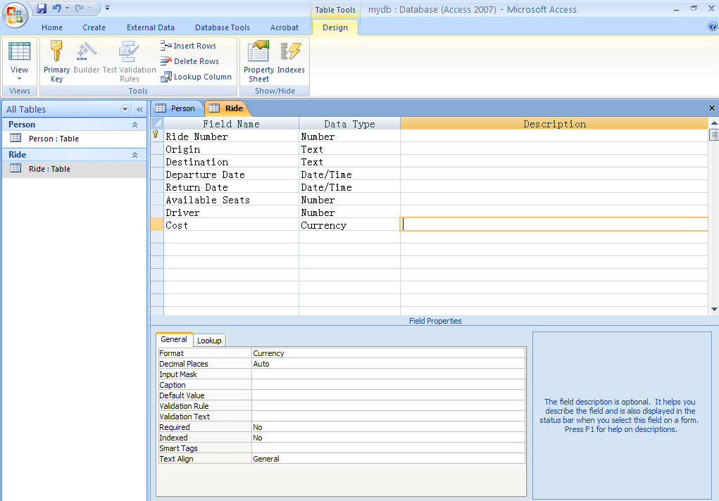 This brief tutorial records the steps I took to build the RideFinder database (in Access 2007). Please refer to the slides for the entity relationship model (or table structures) of the database. This tutorial does not address the various mistakes you might make. If you encounter an error, please either ask me (or the class on Moodle) or search the Web. I may use terms different from the official MS-Access documentation. If you find any mistake in the tutorial or if you have better terms than I use to describe the objects on the interfaces, please let me know.