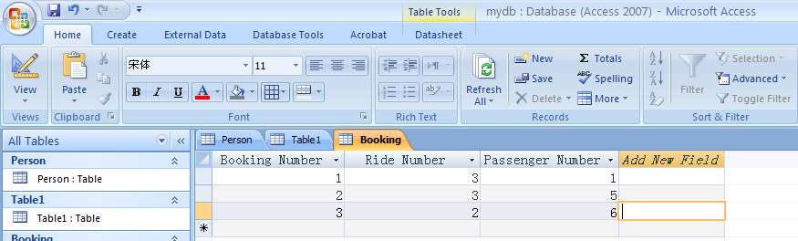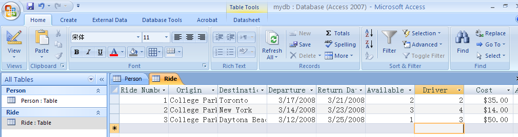 Fill in records for the Ride table (same as Step 3). Highlight the Ride table. In the Ribbon, click View -> Datasheet View --> input data for each record. Click Office --> Save when done. Here are several records of the Ride table.