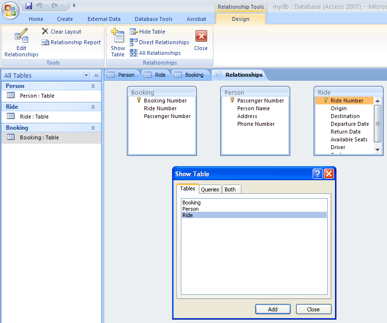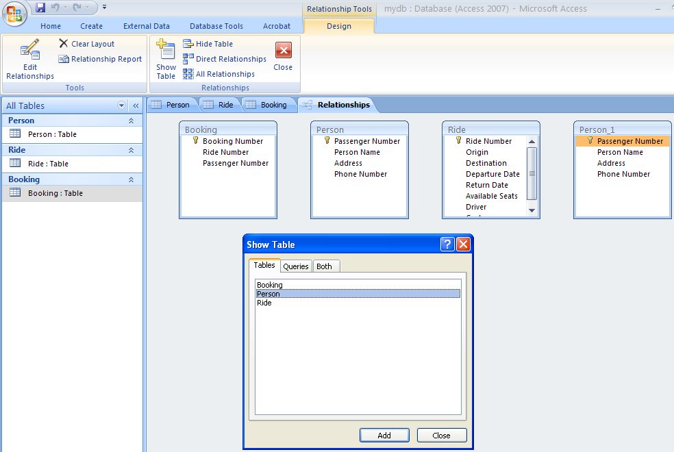 "Driver" in the Ride table is actually a Person entity which has the same attributes as a passenger. I should have used "Person Number" rather than "Passenger Number" in the Person table to be more intuitive. I intentionally use "Passenger Number" in the Person table for the two purposes: (1) distinguishing passenger from driver, and (2) demonstrating manually relating/linking two fields in two tables. "Driver" in the Ride table is a foreign key that refers to "Passenger Number" which is the primary key of the Person table. Note that "Driver" and "Passenger Number" are of the same data type (i.e., number), so I can relate/link them. Fields with different data types (such as text and number) can not be linked; if you try to do so, an error will be reported. In order to relate/link "Driver" with "Passenger Number", I need a copy of the Person table so that the relationship between the tables can be shown clearly. Click "Show Table" again, and click the Person table again and click "Add" to create a copy of the Person table, which is Person_1, as shown in the following screenshort, then click "close."
