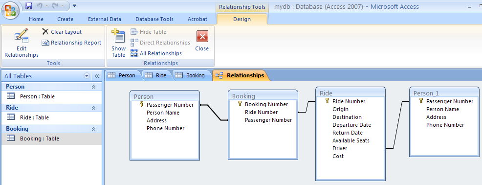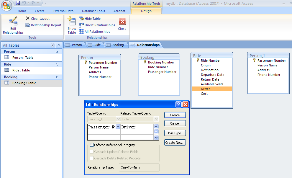 Similarly, create relationships between Booking's Ride Number and Ride's Ride Number, between Person's Passenger Number and Booking's Passenger Number.