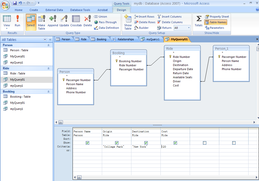 The bottom pane allows me to select the fields I want to display/project on the result of the query, and the conditions I want to restrict. I selected Person.Person Name, Ride.Origin, Ride.Destination, Ride.Cost, and and specified my restriction conditions as shown in the following screenshot. Again, my query is to find all the passengers who need a ride from "College Park" to "New York" with cost less than $20.00. The notation "Person.Name" means the Name field of the Person table. If the "Show" checkbox is checked, that field will be shown on the query result.